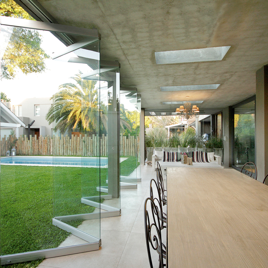 Cerramiento de vidrio plegable (abisagrado) con múltiples configuraciones posibles. Permite una apertura parcial o total del vano sin la necesidad de colocar guía embutida en el suelo. Sincronicidad en el plegado de las hojas con un mínimo esfuerzo manual para cierre o apertura. Brinda la posibilidad de cerrar amplias zonas de paso.